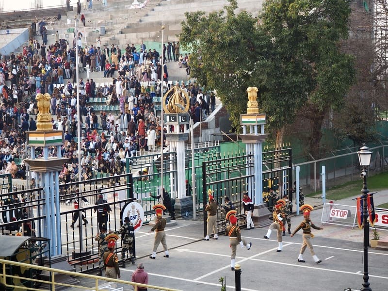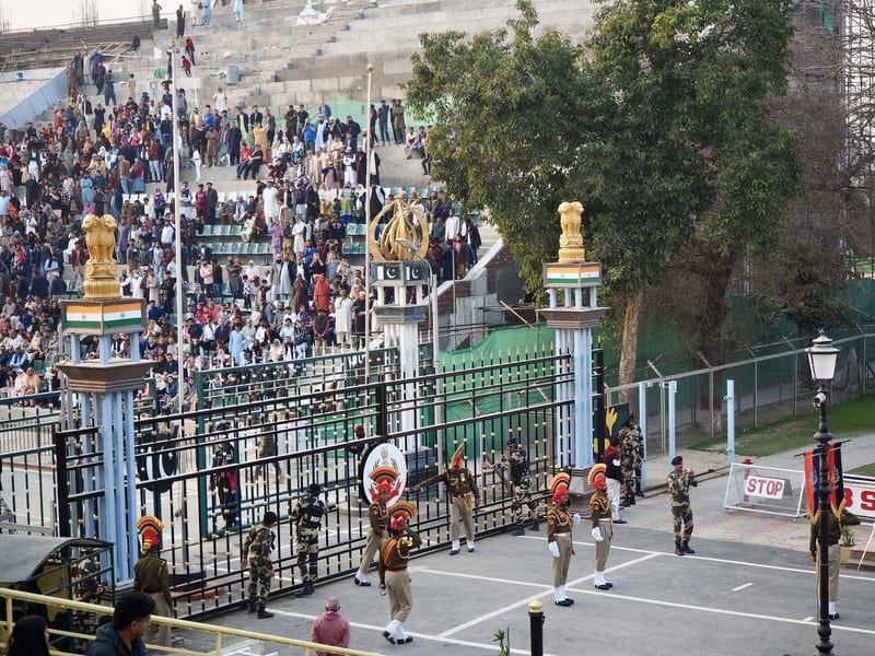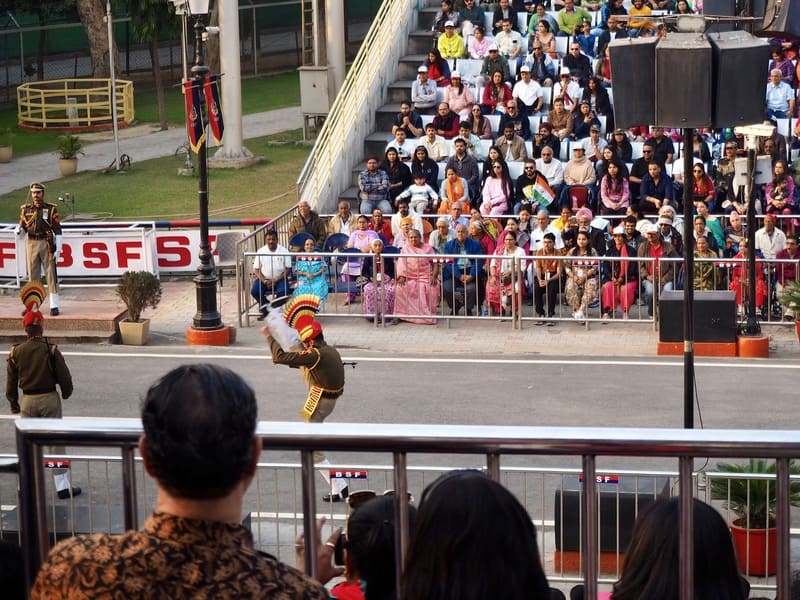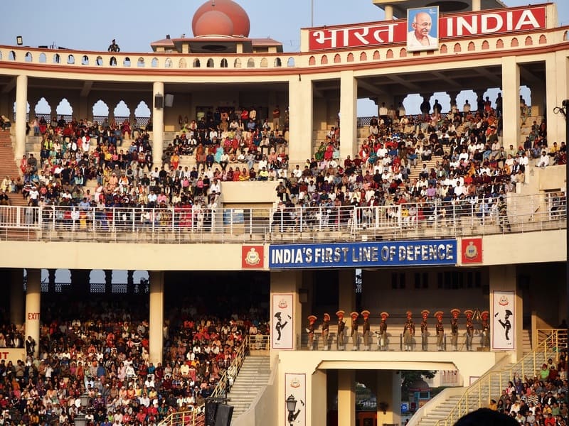 国境では毎日の夕刻、インドとパキスタンの双方の軍が同時に国旗を降ろすフラッグ・セレモニーなるものが行われており、それは、国境ギリギリにまで設けた観客席に大勢のギャラリーを集め、大歓声の中で開催されるエンターテインメントと化したセレモニー。