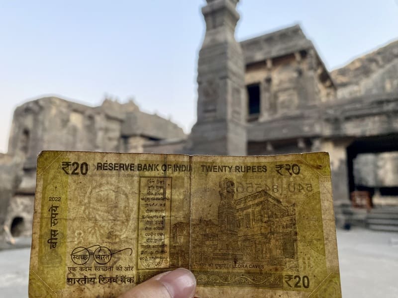カイラーサナータ寺院は20ルピーに描かれており、ハンピのストーン・チャリオット(石の戦車)と同様、持参して一緒に撮影するのが定番。