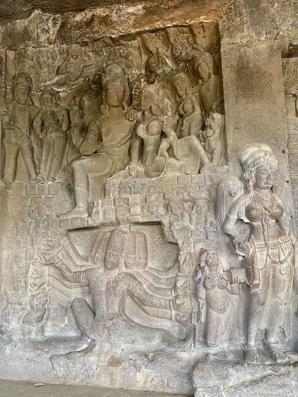 第21窟にも見られたカイラス山を揺らすラーヴァナの彫刻は、繊細なタッチの第21窟に比べると、ややどっしりとした印象の描写。似たような時期に作成されたものですが、このような違いが見て取れるのも面白いもの。