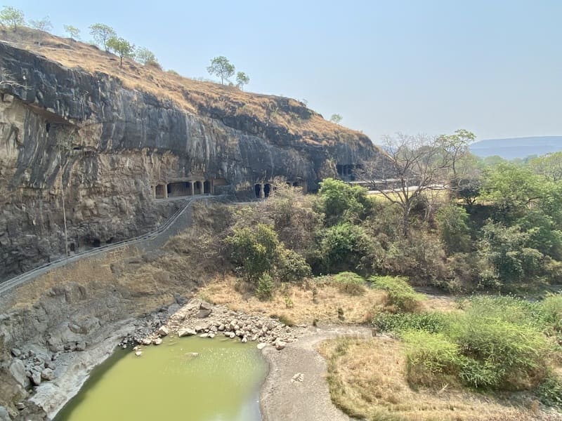 アウランガーバード近郊には、エローラと同じく崖沿いに石窟が並ぶアジャンター石窟群も存在します。混同しやすいですが、その特徴は「仏教窟のみで、壁画が多い」こと。ちなみに、エローラの仏教窟はその存在が昔からよく知られていたために、壁画はほぼ残っていません。