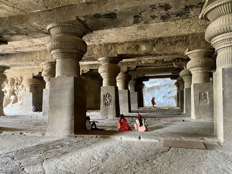 十字型に設計された石窟内部には巨大な石柱が並び、天井も高く、外からの光も届いて開放的な雰囲気。また、インド神話の場面を描いた巨大彫刻が数多く見られることも特徴です。