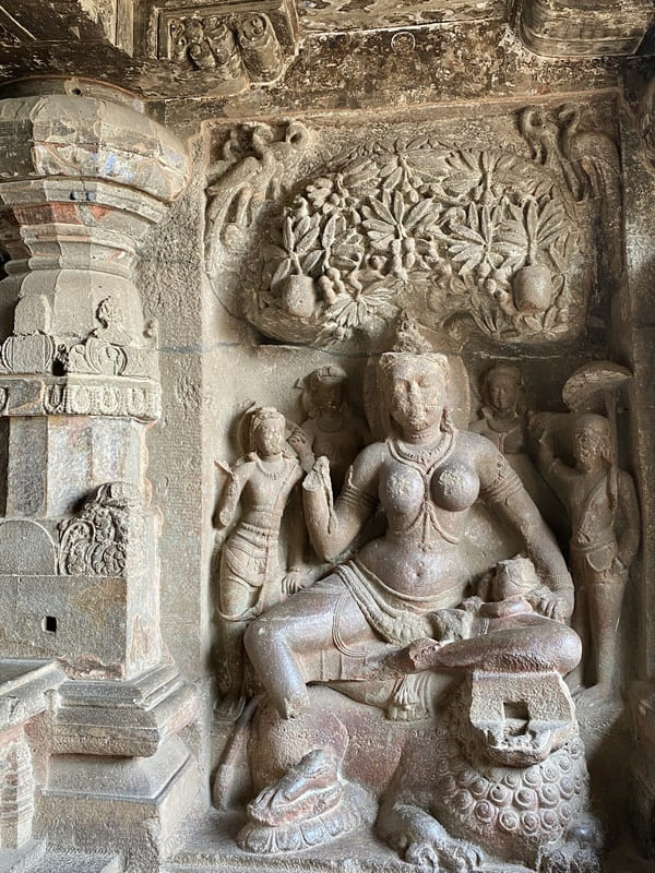 比較的小規模な石窟ですが、柱や梁、天井の至るところに彫刻が施され、バランスや精巧さ、その完成度はエローラの中でも特に秀でていることで有名。その後に建設されるカイラーサナータ寺院へと続く、ヒンドゥー教窟の発展を示す重要なものでもあります。