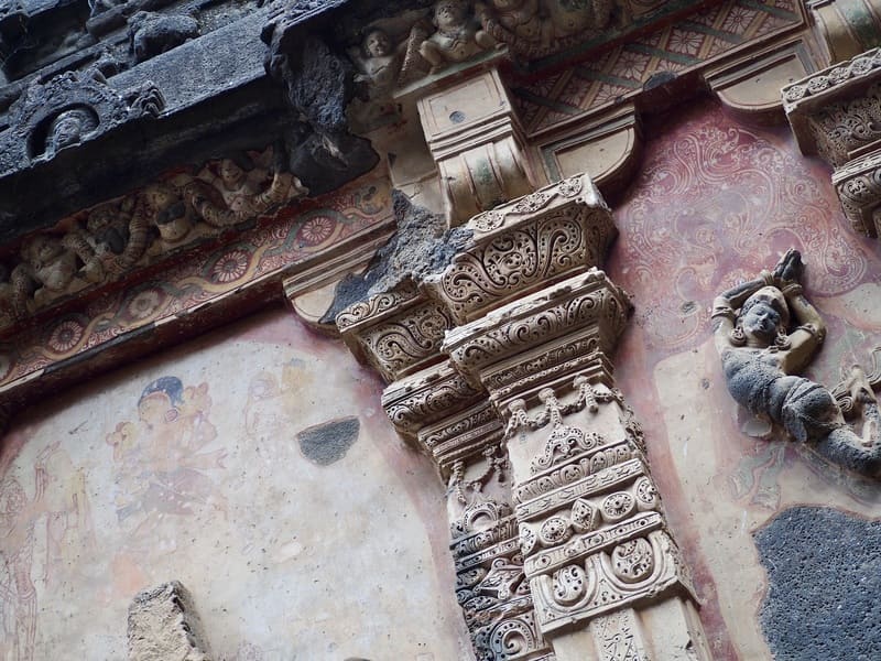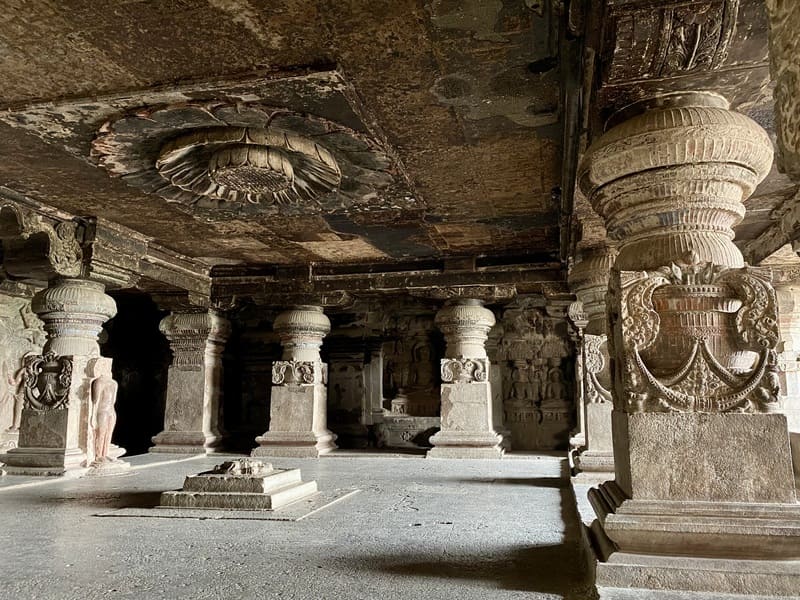 繊細な彫刻を施した柱が並び、天井には蓮の彫刻や絵画、色彩も所々に残されており、仏教窟やヒンドゥー教窟に比べて華やかな印象を受ける石窟内部。