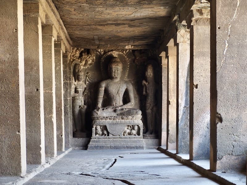 仏教窟には2種類あり、1つはヴィハーラ窟と呼ばれる修行僧が暮らすための僧院。彼らはここで生活しながら瞑想を行ったため、瞑想室を中心に寝室などの居住スペースがあり、階層構造の大きな石窟が特徴。また、エローラの仏教窟は大半がヴィハーラ窟にあたります。