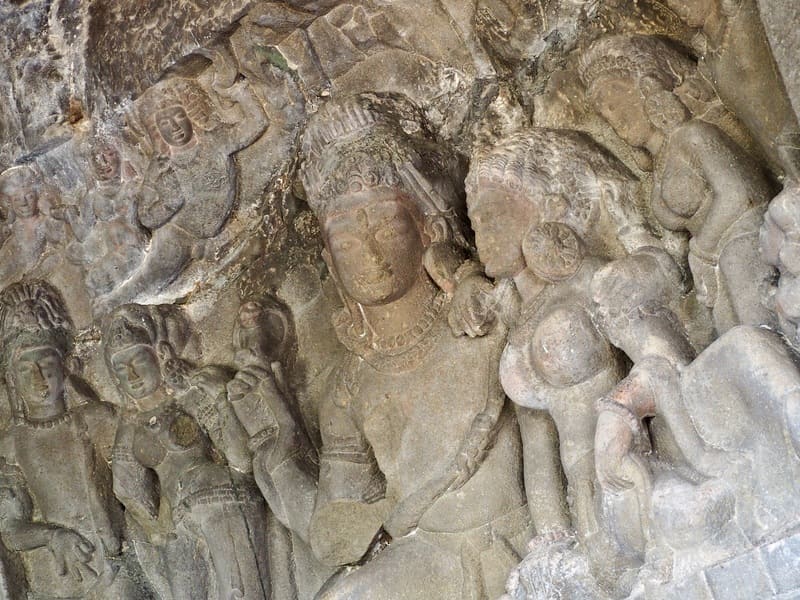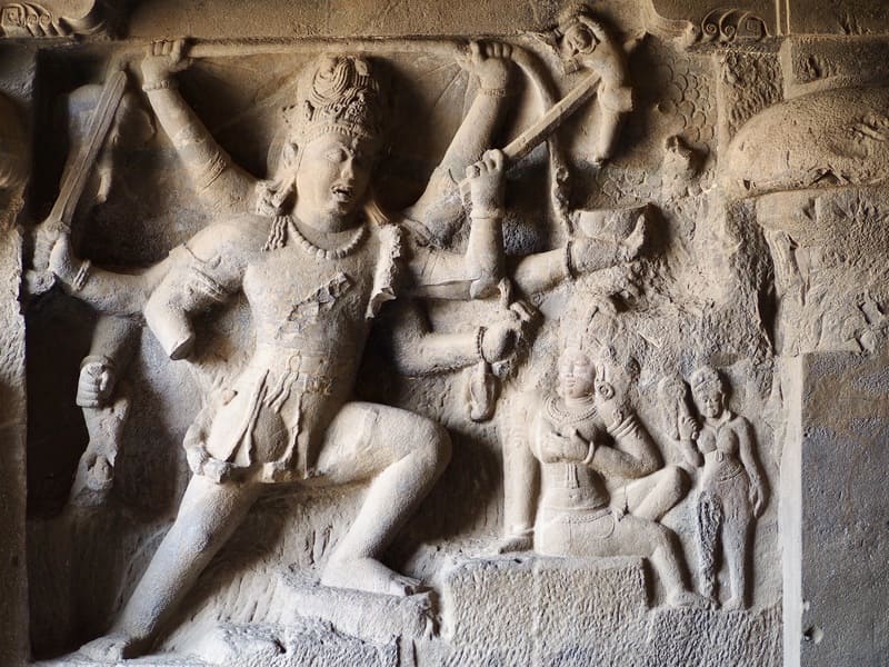 ヒンドゥー教窟には、仏教窟におけるヴィハーラ窟(僧侶の修行の場)のようなものはありません。おもに神々を祀るために作られており、インド神話上の神々の戦いなどを描いたダイナミックで複雑な彫刻が見られることが特徴です。