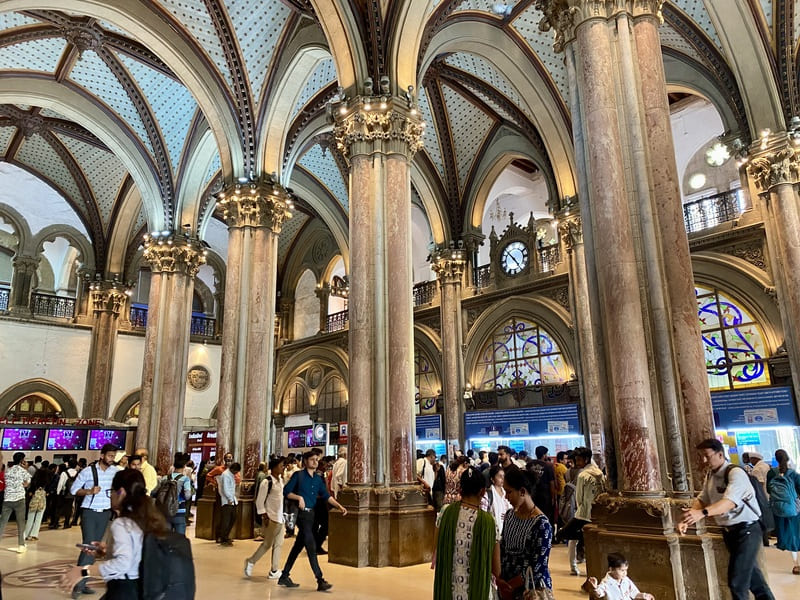 イギリス統治時代の代表作とされる駅舎には、印象的な高いドーム、繊細な彫刻やステンドグラスが施されて芸術作品のようなゴシック様式。