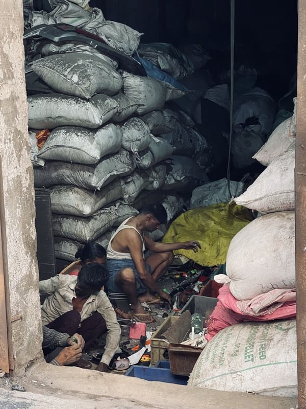 昼下がりのムンバイで偶然見かけたダッバーワーラーと弁当箱たち。空の弁当箱を家庭に戻す途中でしょうか。