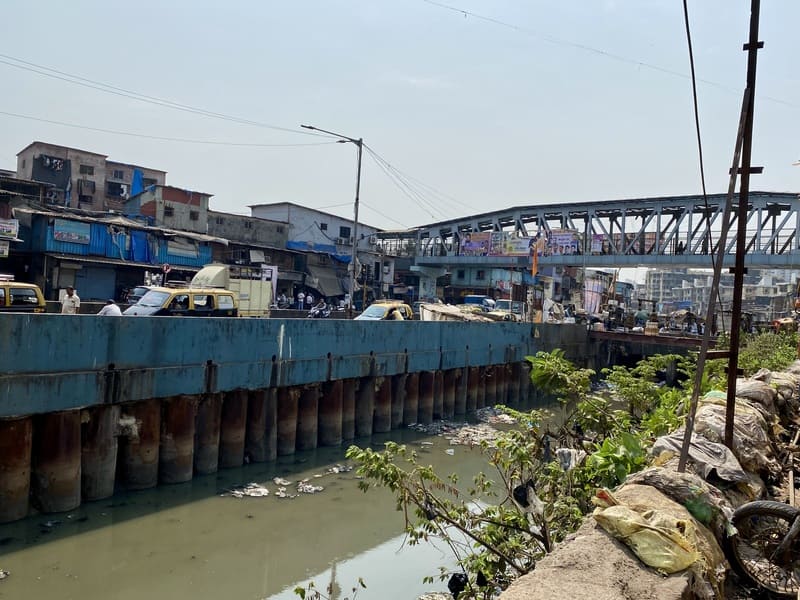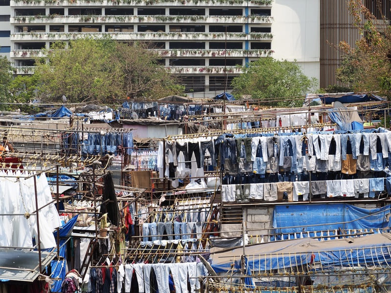 ドービー・ガートとは、ムンバイで100年以上の歴史を持つ屋外洗濯場。Mahalaxmi駅の上に架かる陸橋からその広大な敷地を見渡せ、ロープに吊るされた無数の洗濯物が風になびく光景が広がっています。